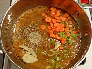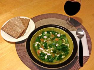 vegetables Chop the two onions Mize the 2 garlic cloves Slice the celery stalk and carrots Wash the escarole leaves Cut into ½ inch wide pieces, including the stems. Stew Soft Vegetables in big soup pot: Braise chopped onions for 5 min Add mince garlic until fragrant Cool down and deglaze with one cup no-salt vegetable broth Add Hard Vegetables Add 4 cups of water (add one cup less if using cans and their liquid) Add sliced celery and diced carrot Add bay leaves and mix in oregano Let simmer for 20 min Add Beans and Escarole Add beans and mix under Add escarole, fold under batch-wise by placing them at the circumference of the pot and then covering them with broth and beans scooped out from the center of the pot. Simmer gently for 20 min, folding under from time to time Ready to Serve Fill into bowls and sprinkle with nutmeg Serve with crisp bread or toasted coarse grained bread. |