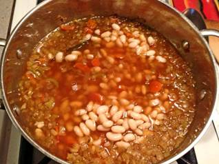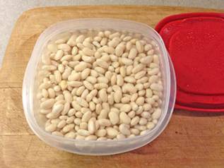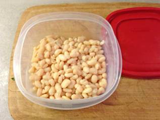 Recipe (Modified from What Do You do with this Stuff, p21) For 4 generous Portion. Prep time 90 min. Prepare the Beans Soak in fridge overnight 4 One-Third-Cup measures of great Northern white beans in 4 cups of water. Wash beans and cook partially for 30 min only so that they are still a bit hard in their center. Then let slowly cool down. Prepare the