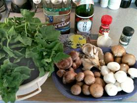 Get in Advance: 1 pound of mixed mushrooms (shiitake, enoki, shimeji, oyster, crimini, trumet, etc.) 3 cloves of garlic, chopped 2 tablespoons of white rice wine - Sake 1 teaspoon of crushed Sichuan peppercorn 1/4 teaspoon red pepper flakes Big bunch of New Zealand spinach Have On Hand: Basmati rice |