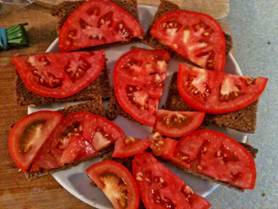 Recipe (home derived) For 1 (generous)-to 2 Portion. Prep time: 10 min Prepare Clean and chop the chives Wash and slice tomatoes Place tomatoes on a slice of bread Cut the bread in mouth-sized pieces and sprinkle densely with chives. |
