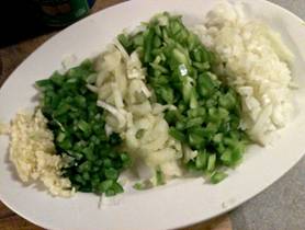 vegetables Chop onion, green bell pepper, celery, jalapeno pepper and garlic Start Stock In a large soup pot Over high heat stir onion until brown (3-5 min) Add ½ cup of vegetable broth and solubilize caramelized layer Add bay leaf, cumin and oregano Cook covered for 5 min Then add celery, green bell pepper, jalapeno pepper and garlic Cook until fragrant (1/2 min) Add “ground beef” Bring to a boil and let simmer covered for 5 min stirring frequently for preventing burning at the bottom Add add tomatoes with fluid Season with 2 tablespoons of chili powder and ½ of ¼ teaspoon of ground black pepper Wash and add kidney beans, black beans and garbanzo beans Bring to a boil and simmer covered for 45 min. Stir corn in and continue to cook for 5 min Serve Garnish with plenty of cilantro and serve with toasted whole grain bread |