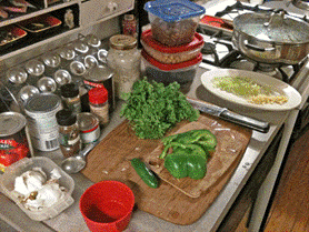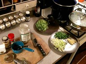 Get in Advance: 1/2 onion, chopped 1/2 green bell pepper, chopped 1 stalks of celery, chopped 1 jalapeno pepper, chopped 3 large gloves of garlic, minced ½ cup of low-salt low-fat vegetable broth 1 Bay leaf ½ teaspoon of cumin 1 tablespoon of dried oregano 2 tablespoons of chili powder ½ of a ¼ teaspoon black pepper 12oz package of vegetarian “ground beef” 8oz kidney beans 8oz garbanzo beans 8oz black beans 16oz whole kernel corn 16 oz fire-roasted diced tomatoes Have On Hand: 1 cup of cilantro, chopped |