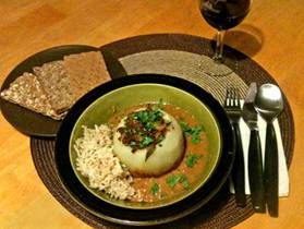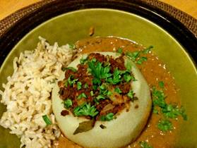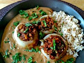 for 45-60 min (it will get stiffer) Prepare vegetables Finely chop ½ medium onion Mince 1 medium clove of garlic Cut top of kohlrabi bulbs, clean and flatten bottom so that they can stand upright. Peal kohlrabi Scoop out inside from top Chop pulp finely, set aside Boil shells in water in a separate pot for 10 min, still staying firm. Trim and wash kohlrabi leaves and remove tough center ribs Bundle leaves, cut length-wise, then vertically into ¼ inch ribbons, then chop finely. Set aside Make filling In a large skillet braise onions and garlic Add and combine 1 cup ground tofu ¼ cup of rice 1 tablespoon of chopped parsley 1 tablespoon paprika ½ of a quarter teaspoon of marjoram ½ of a quarter teaspoon of caraway seeds 1 tablespoon of tomato paste ¼ cup of chopped kohlrabi pulp ¼ cup of chopped washed leaves Cook Kohlrabi In the skillet fill each hollowed bulb with a mound of stuffing, add 3 tablespoons of broth Place the kohlrabi shells closely together in center of the skillet Distribute remaining stuffing around the kohlrabi Add 2 cups of low-salt vegetable broth Simmer half-covered for 30-60 min until shells start to soften Remove cooked kohlrabi and set aside. Make white cream sauce Add to skillet ¼ cup of non-fat soy milk with dissolved 1 tablespoon of corn starch Heat and stir vigorously to thicken sauce evenly without clumping Turn off heat Stir in 1/2 cup of tofu sweet cream Serve Place cooked kohlrabi into the serving dishes Add on one side rice Add plenty of cream sauce Garnish with chopped fresh parsley Serve with crisp bread |