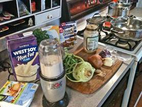 Get in Advance: 1 cup of Basmati rice 1 14oz pkg Nasoya Lite Firm Tofu 1 tablespoon vanilla extract ½ teaspoon confectioner’s sugar 1 tablespoon fat-free soy milk ½ onion, chopped 2 garlic cloves, minced 4 kohlrabi, bulbs peeled, stems discarded, leaves trimmed of center ribs) 2 cups ground tofu 1 bunch of fresh parsley 1 tablespoon sweet paprika ½ of quarter teaspoon marjoram ½ of quarter teaspoon caraway seeds 2 tablespoons tomato paste 3 cups of low-salt no-fat vegetable broth 1 tablespoon corn starch ½ cup parsley, chopped Have On Hand: Crips bread |