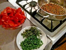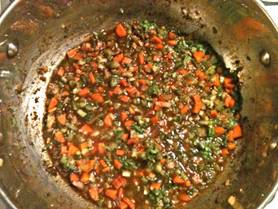 Get in Advance: ½ medium onion, finely chopped 2 garlic clove, minced 1 small carrot, finely chopped 1 stalk of celery with green top, finely chopped 1 cup of low-salt low-fat vegetable broth, divided 2 ½ pound of fresh tomatoes, cut in small pieces with stem basis discarded ½ cup of parsley, finely chopped ½ cup of basil, finely chopped 1 teaspoon of tomato paste |