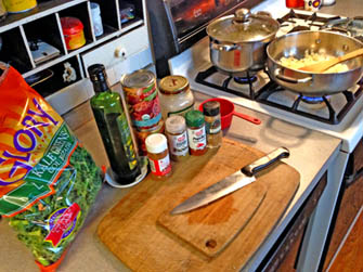 Recipe (after comfybelly.com, modified): For 4 (generous)-to 7 (1.5 cups) Portions. Total prep time: 1 hr. Prepare the French green lentils 1 lb dry green French lentils (2 cups) Add 6 cups of water Cook covered for 25 min If required, add additional water for keeping the lentils covered Prepare the greens and extras Cut the onions in half lengthwise and chop finely Wash the kale leaves, separate and discard the stems, then bundle the leaves and cut them into ½-1 inch ribbons, then cut across into pieces Cook the soup In a large heavy skillet or soup pot Braise the onion on high heat without oil until soft and lightly browned – 5 min Deglaze with 1 cup of water Add 2 tablespoons olive oil Add spices and drained lentils, mix Add2 ½ cups of vegetable broth Add tomatoes, fold under lentils Add kale and fold under soup mixture Add 2 ½ cups water Let simmer for 10 min with closed lid. Add more water for adjusting to desired consistency Serve with crisp bread and red wine. |