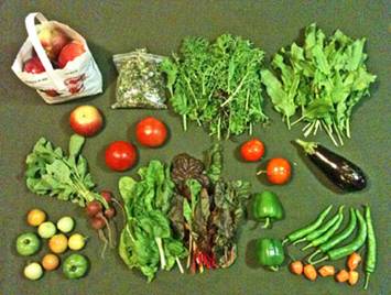 Apples Kale Sprouts (buckwheat, sunflower, radish) Eggplant Pattypan squash Green tomatoes Radicchio Scallions Lemon basil and chives Chard or mustard greens Turkish eggplant |
