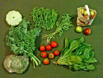 Apples Kale Sprouts (buckwheat, sunflower, radish) Eggplant Pattypan squash Green tomatoes Radicchio Scallions Lemon basil and chives Chard or mustard greens Turkish eggplant |