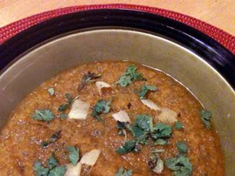 This hearty summer soup stands on its own as a full meal. Its sweetish tasting stock is wonderfully countered by the ginger and garlic with a refreshing sweet-sour kick from red wine and lemon juice. |