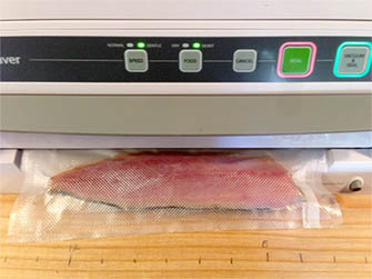 filet, fresh, deboned FoodSaver Vacuum Sealer Vacuum Sealing 1. Wrap each portion in clear plastic wrap 2. Cut 4 inch long pieces from 8-in wide Heat-Seal Roll 3. Seal one end of roll section 4. Place portion into created pouch 5. Vacuum & Seal the filled pouch with “Gentile” &” Moist” setting Freezing Place in single layer for fast even freezing |