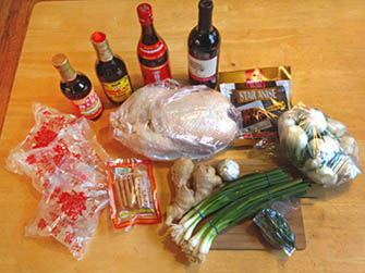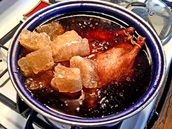 The Chinese red roast cooking uses dark soy sauce (producing the red duck meat color), Shaoxing wine and rock sugar for deriving the special flavors. It combines 1/3 soy sauce (2 cups dark and 2 cups light). 1/3 wine (3 cups dry red and 1 cup Shaoxing or Sherry wine), and 1/3 water (4 cups). Simmered for 2 ½ to 3 hours cooks the duck to a velvet soft texture.