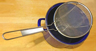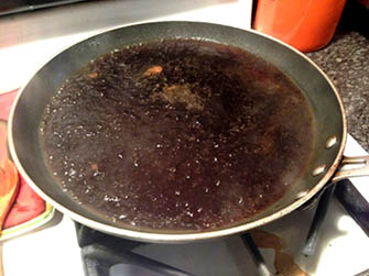 Transfer 6 cups of broth, strained through the fine-meshed ladle, into a pan and reduce it over high heat to a light syrupy consistency in about 20 min.
