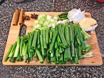 2 bunches scallions, white parts sliced into 3-inch lengths, green parts sliced 1/8 inch thick (or other way around)  - divided