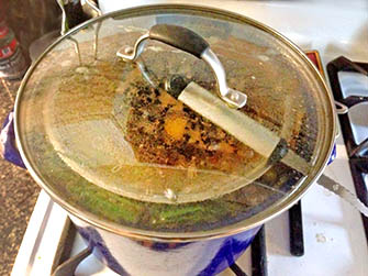 If duck is not fully immersed, submerge it by mechanical means, i.e., place liquid-filled pan on duck or used fine-meshed ladle hold down by the coking lid
