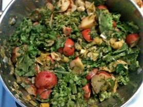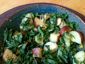 Potatoes Heat 3/4 cup no-salt vegetable broth in big soup pot Wash red potatoes, do not peels Half, quarter or cut into ½ inch wide slices. Add potatoes Trim leaks, half length-wise, wash thoroughly, cut into ¼ in pieces and add Add garlic and pepper Cover and sweat for 15-20 min or until potatoes are fork-soft. Stir often. Prepare Curly Endive Wash endives carefully, remove wilted or brown leaves and central hard stems if present Bunch heads and cut into ½ inch pieces Set aside Prepare Herbs Wash and cut dill Wash and cut mint Mix potatoes with Endive, Dill and Lemon ATTENTION: Timing is important so that endives do not mush! When potatoes are done, add juice of ½ lemon, then fold under dill and finally endives. Cook for an additional 1-2 minutes only preventing endives to collapse into a green pulp. Serve right away BEFORE endives start to wilt because the greens will continue to warm while off the stove! Ready to Serve Divide onto plates, sprinkle with chopped mint. |