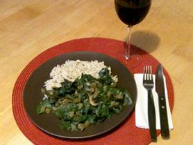 rice Cook 1 cup of rice with 2 cups of water for 25-30 min. Cook the chard Use a big casserole and add the ¼ white wine Sautee onions and garlic for 3-5 min until onions get translucent Add mushrooms, scallions and pepper and stir for 2-5 min until pepper is soft. Add vinegar, cumin, pepper, paprika, ginger and cinnamon. Add ½ cup of vegetable broth and the chard and turn it under. Simmer covered for 2 min until it starts to wilt but is tender. Ready to Serve Serve immediately |