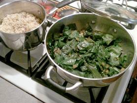 Swiss chard freshly picked from the CSA farm is a great tasting leafy vegetable. Enriched with braised mushrooms and served over brown rice chard delivers a full dinner course. |