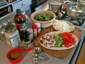 Get in Advance: 1 cup Basmati rice 1 small onion, chopped 1 garlic clove, minced 4 white mushrooms, sliced 3 green onions (scallions), minced 1 green/red pepper. Chopped 2 tablespoons of cider vinegar 1/2 teaspoon ground cumin ¼ teaspoon ground white pepper ½ teaspoon paprika ¼ teaspoon ground ginger ½ of ¼ teaspoon cinnamon 1/2 cup of low-salt low-fat vegetable broth 1 bunch of Swiss Chard, washed, long stems removed, roughly cut Have On Hand: ¼ cup of white vine |