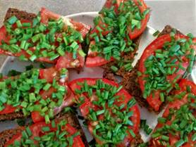 Recipe (home derived) For 1 (generous)-to 2 Portion. Prep time: 10 min Prepare Clean and chop the chives Wash and slice tomatoes Place tomatoes on a slice of bread Cut the bread in mouth-sized pieces and sprinkle densely with chives. |