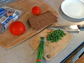 Get in Advance: 2 fresh field-ripe tomatoes 1 bundle of chives 1 package of Pumpernickel whole grain sourdough bread (holds opened in the fridge for months) |