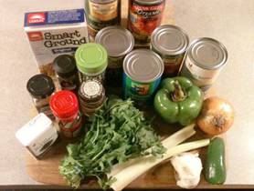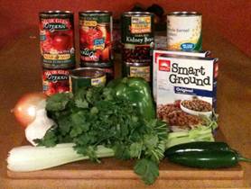 Get in Advance: 1/2 onion, chopped 1/2 green bell pepper, chopped 1 stalks of celery, chopped 1 jalapeno pepper, chopped 3 large gloves of garlic, minced ½ cup of low-salt low-fat vegetable broth 1 Bay leaf ½ teaspoon of cumin 1 tablespoon of dried oregano 2 tablespoons of chili powder ½ of a ¼ teaspoon black pepper 12oz package of vegetarian “ground beef” 8oz kidney beans 8oz garbanzo beans 8oz black beans 16oz whole kernel corn 16 oz fire-roasted diced tomatoes Have On Hand: 1 cup of cilantro, chopped |