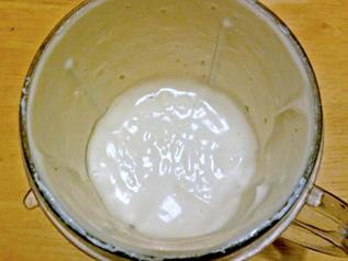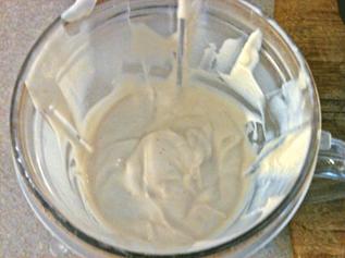 Recipe (Adapted from recipe #6985 at vegweb,com): For 2 - 3 portions (preparation time 15 min). Blend Use a small blender and add 7.5 oz Nasoya Lite Firm Tofu Lemon juice and cider vinegar Garlic powder Blend to a smooth creamy consistency. For easy blending use a self-maintaining vortex (see picture) of the mixture. The two tablespoons of fluid should be enough but if necessary lower viscosity a bit with more lemon juice. Let Cool in Fridge Let “runny” creamy mixture cool and settle for 45-60 min in fridge. It will stiffen up to a smooth light cream texture (see picture) Comment: Taste and consistency depends mainly on the kind and freshness of tofu used. I use a Magic Bullet blender and place the blender cup with the mixed cream for settling into the fridge. |