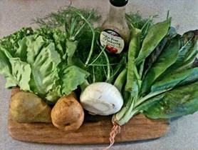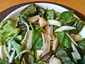This is salad heaven for gustatory adventures providing an unexpected rich pallet of invigorating flavors and textures. The natural bitterness of the green is buffered by the added green leaf lettuce but contrasted by the liquorish sweet taste of the fennel and the rich sweet bosc pears. The crisp but firm texture all of the greens enhance their presentation. |