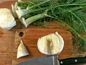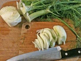 Cutting the halfed fennel bulb lenth-wise