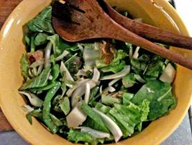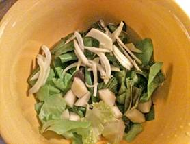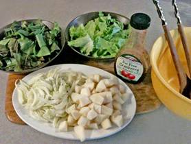 fennel bulb and pears Half the fennel bulb, cut in half and remove the core. The, slice the halves length-wise Peel the Bosc pears, half, core and cut into small pieces Prepare the lettuce Detach the leaves from stem and wash thoroughly Rip the green lettuce into small bite-size pieces Cut out the central stems of radicchio leaves and then rip into small bite-size pieces Dispose of stems and core Tossing the salad Put two tablespoons of raspberry dressing into the salad bowl Place all four ingredients in small batches into the bowl and combine carefully with dressing Serve with crisp bread |