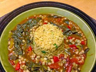 A delicious Louisiana gumbo prepared with a dark “roux” made from braised onions, beer and barley used as thickener as well as for white meat replacement. The full-bodied Cajun flavor and the supple texture and refreshing slight bitterness of the greens provided for a feast. |