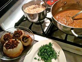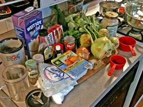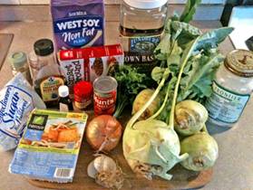 Get in Advance: 1 cup of Basmati rice 1 14oz pkg Nasoya Lite Firm Tofu 1 tablespoon vanilla extract ½ teaspoon confectioner’s sugar 1 tablespoon fat-free soy milk ½ onion, chopped 2 garlic cloves, minced 4 kohlrabi, bulbs peeled, stems discarded, leaves trimmed of center ribs) 2 cups ground tofu 1 bunch of fresh parsley 1 tablespoon sweet paprika ½ of quarter teaspoon marjoram ½ of quarter teaspoon caraway seeds 2 tablespoons tomato paste 3 cups of low-salt no-fat vegetable broth 1 tablespoon corn starch ½ cup parsley, chopped Have On Hand: Crips bread |