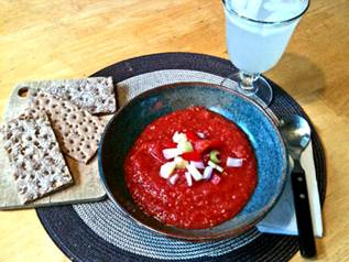 Get in Advance: 3 large (or 10 small) ripe tomatoes, peeled and chopped ½ large red onion, chopped 1 cucumbers, peeled and sliced 2 sweet red bell peppers, seeded and chopped ½ stalk of celery, coarsely chopped 3 cloves garlic or 2 long garlic scapes, chopped 2 tablespoons red wine vinegar ½ tablespoon raw honey (or Agave syrup) 1quarter teaspoon smoked paprika ½ teaspoon hot sauce 2 tablespoons tomato paste (optional) Have On Hand: Lemon juice, Crisp bread |