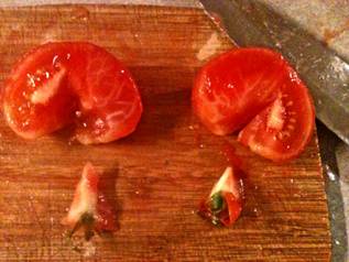 The cracked tomato skin facilitates stripping it off