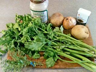 Get in Advance: 2 large bunches celery tops 1 large onion, chopped 2 medium all-purpose potatoes, peeled (or unpeeled new potatoes), cut into ¼ in cubes 1 bunch of thyme springs ½ cup of white wine 1 quarter teaspoon black pepper 4 ½ cups of low salt vegetable broth Have On Hand: crisp bread |