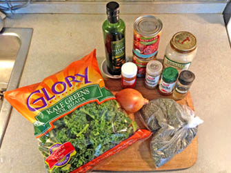 Recipe (after comfybelly.com, modified): For 4 (generous)-to 7 (1.5 cups) Portions. Total prep time: 1 hr. Prepare the French green lentils 1 lb dry green French lentils (2 cups) Add 6 cups of water Cook covered for 25 min If required, add additional water for keeping the lentils covered Prepare the greens and extras Cut the onions in half lengthwise and chop finely Wash the kale leaves, separate and discard the stems, then bundle the leaves and cut them into ½-1 inch ribbons, then cut across into pieces Cook the soup In a large heavy skillet or soup pot Braise the onion on high heat without oil until soft and lightly browned – 5 min Deglaze with 1 cup of water Add 2 tablespoons olive oil Add spices and drained lentils, mix Add2 ½ cups of vegetable broth Add tomatoes, fold under lentils Add kale and fold under soup mixture Add 2 ½ cups water Let simmer for 10 min with closed lid. Add more water for adjusting to desired consistency Serve with crisp bread and red wine. |