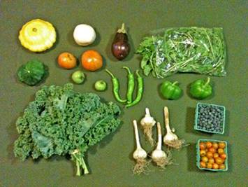 Kohlrabi Tomatoes Hot Peppers Beets Squash Misc braising greens Kale Collard greens Garlic Blueberries |