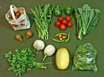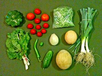 Eggplant (white) Tomatoes Green peppers Hot peppers (cayenne, poblano, habernero) Chard and/or kale and/or mustard greens Squash (acorn or spaghetti or