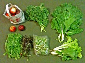 Kale Sprouts (buckwheat, sunflower) Mix of other (kale, choi, bekana cabbage) Mixed greens (endive, chard, etc) Apples |