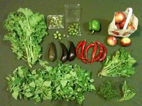 leeks, corn stalks, yokka-na, small tomatilloes, Very small amounts of Lettuce, mustard, kale,