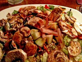 Fresh salad items with sliced mushrooms but without any dressing or garnish. I covered the salad with fat-free salad dressing (Annie’s Raspberry Balsamic). Delicious!